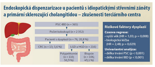 Stude popisuje záchyt kolorektálních neoplazií v dispenzárním programu v dobře definované a doposud největší publikované monocentrické kohortě pacientů s PSC-IBD, včetně těch po transplantaci jater. Mezi nezávislý rizikový faktor vzniku kolorektálních neoplazií patří vyšší věk pacientů a biologická léčba. Kohorta se záchytem dysplazií měla signifikantně delší dobu trvání PSC i IBD. Vysoký záchyt dysplazií z náhodných a cílených biopsií podporuje jejich klinický přínos během dispenzárních koloskopií u vysoce rizikových skupin s IBD.